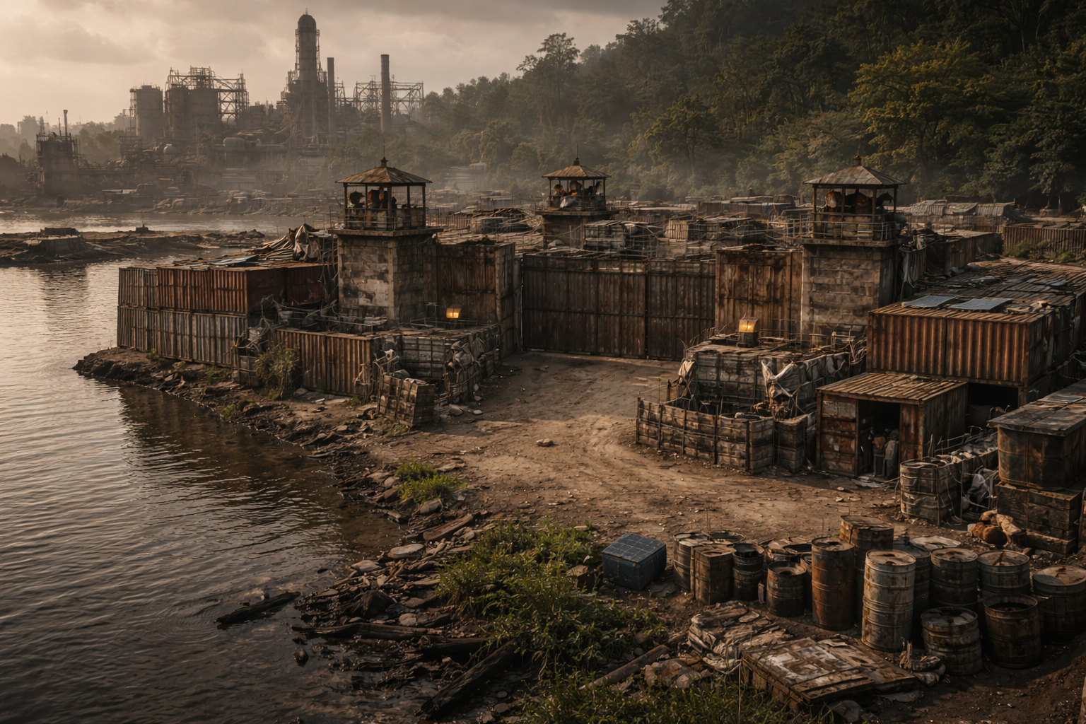 Die Konklave nutzt eine zerstörte Raffinerie als natürliche Festung.- Außenring aus Stahlzäunen, Containern und Betonresten