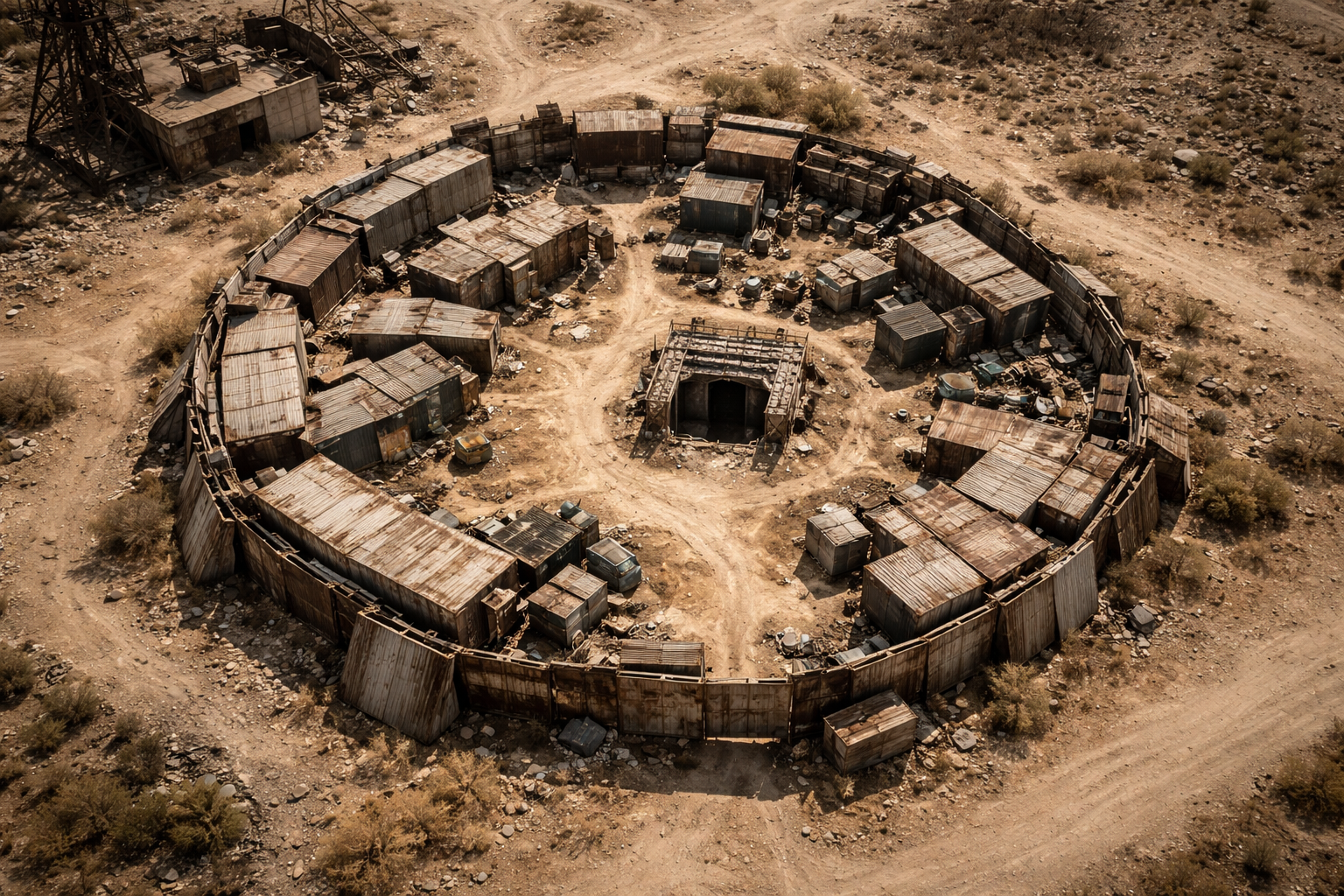Dust Covenant ist keine klassische „Siedlung“. Die sichtbare Konklave ist nur eine Hülle – das eigentliche Leben liegt darunter.- Oberfläche: Ruinenring aus Stahlplatten, Containersegmenten, Betonbarrieren