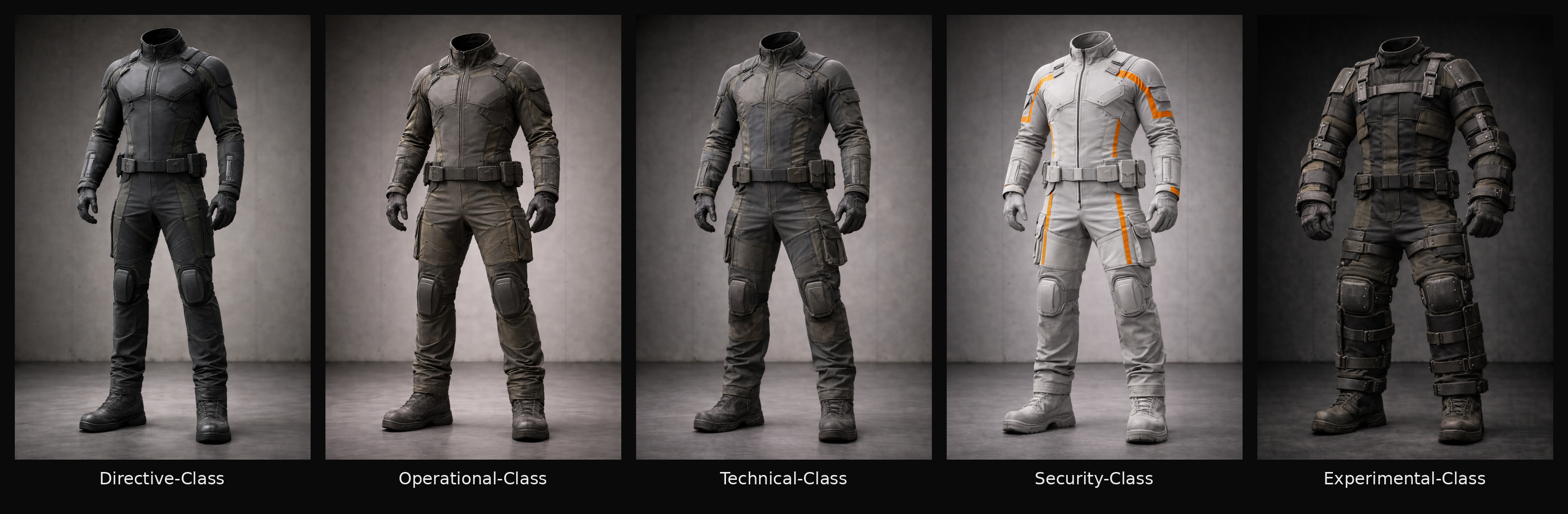 Obwohl alle Kern-Anzüge einer gemeinsamen Design- und Systemlogik folgten, wurden sie nach ihrer primären Funktion in mehrere Funktionsklassen unterteilt. Diese Klassen beschrieben nicht den Rang eines Trägers, sondern dessen Rolle innerhalb des Systems.- Directive-Class – Führung, Analyse und Überwachung