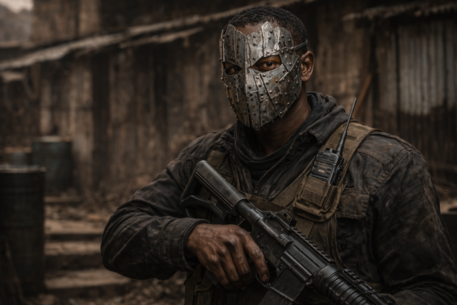 Sein Name stammt nicht von Gold oder Luxus. In den ersten Monaten nach dem Einschlag trug Mandla tatsächlich eine improvisierte „Krone“: ein schmaler, gezackter Ring aus zugeschnittenem Blech – roh, scharfkantig, ohne Prunk. Es war ein Zeichen, das jeder verstand: Das hier gehört mir.Doch die Krone verschwand schnell. Mandla ersetzte sie durch etwas Wirksameres: eine Maske. Schwer, genietet, aus Metallplatten zusammengesetzt, wie eine zweite Haut. Die Maske macht aus ihm keine Figur – sie macht aus ihm ein Symbol. Kein Gesicht, keine Emotion, keine Menschlichkeit. Nur Kontrolle.