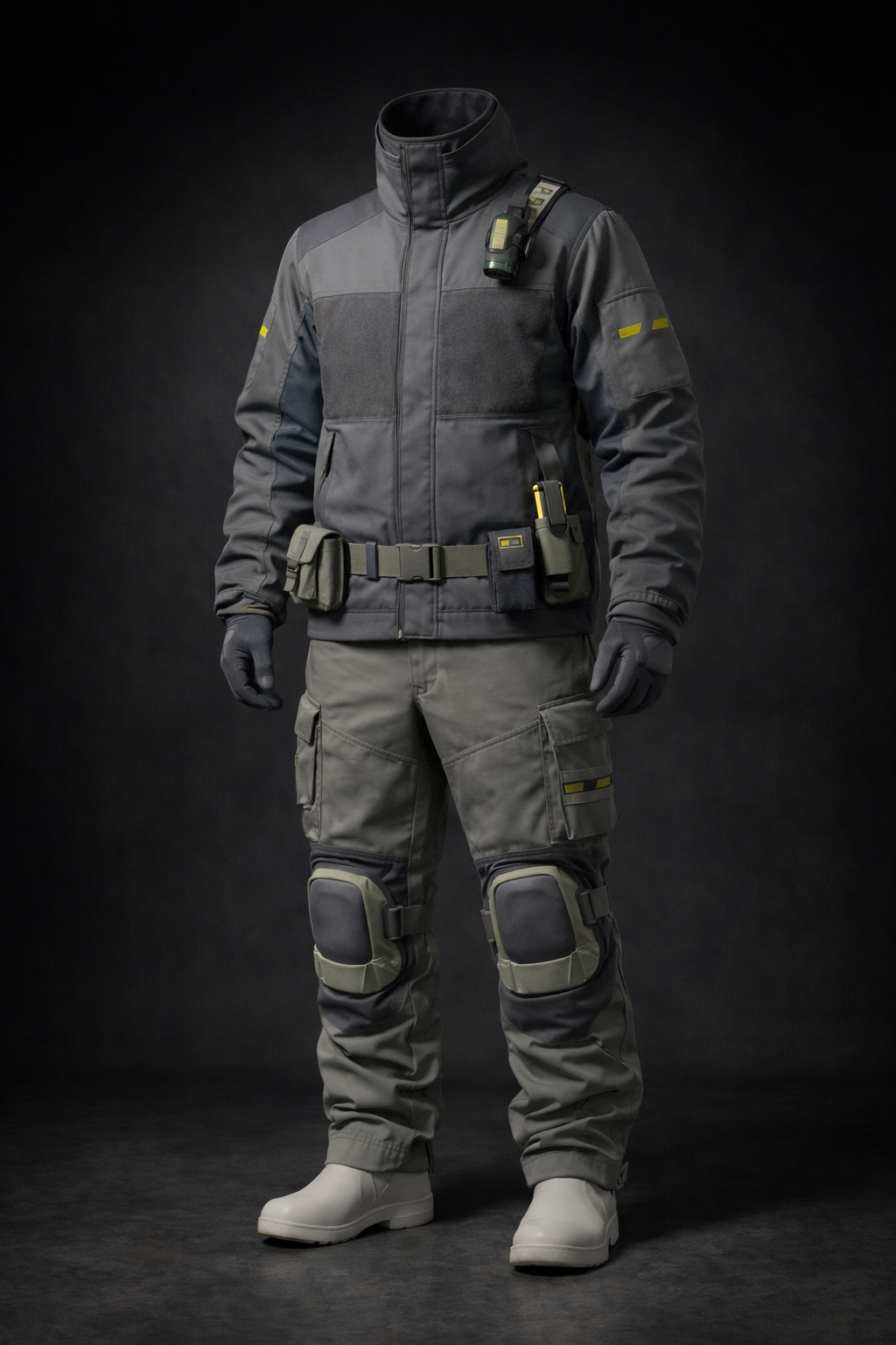 Das Outfit wirkt technischer und „härter“ als Lab-Profile, bleibt aber klar Forschung. Es erinnert eher an Ingenieur-Prüfkleidung als an Forschungspersonal.- verstärkte Frontzonen gegen Funken, Abrieb und Splitter