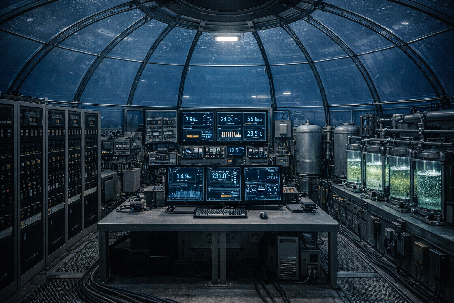 Die Anlage bestand aus mehreren Technikmodulen, die unter einer transparenten Druckhülle zusammengeführt waren.- zentrale transparente Kuppelstruktur aus druckstabilem Polymerverbund