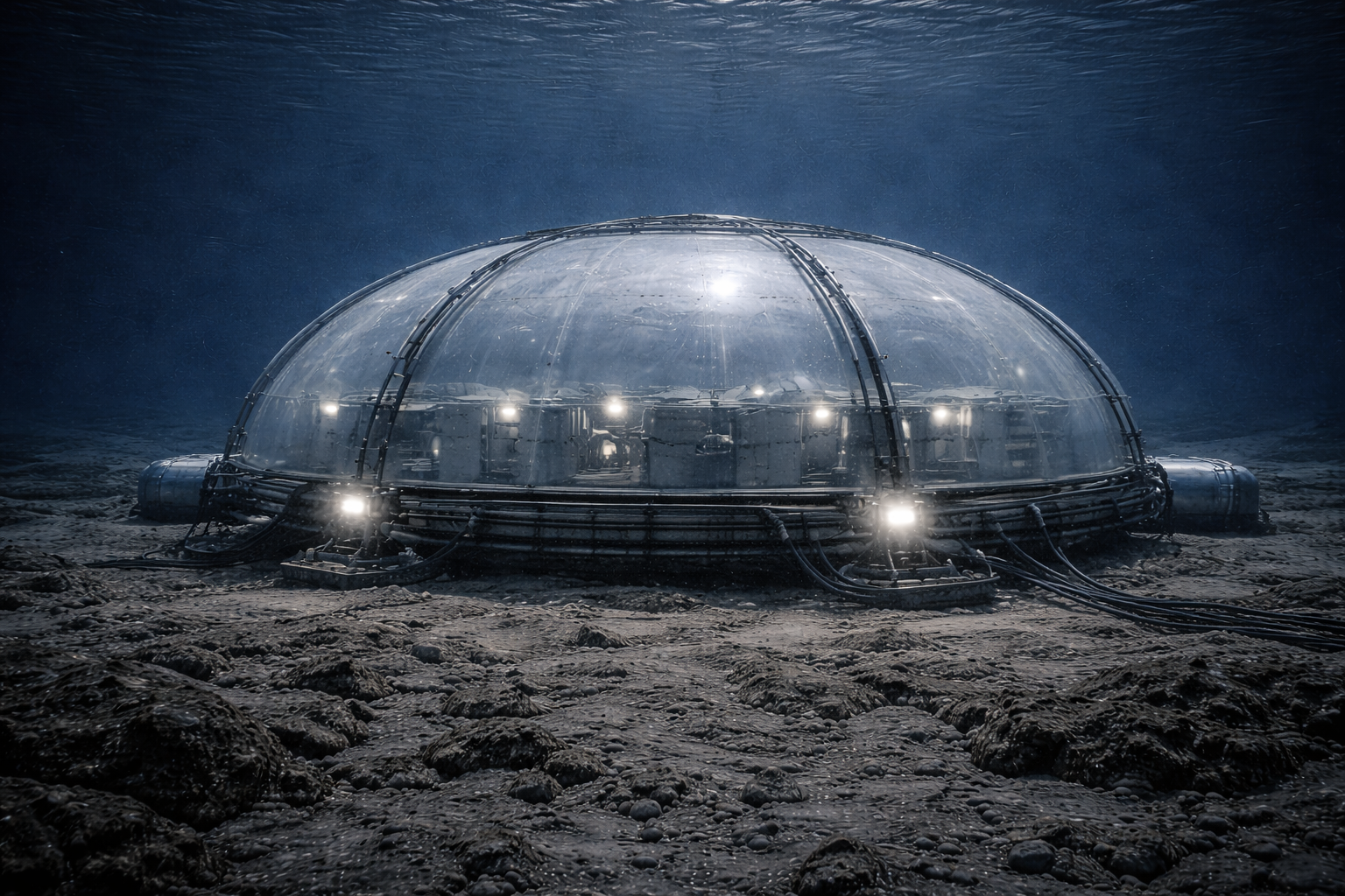 Die Anlage bestand aus mehreren integrierten Modulen unter einer großen transparenten Druckkuppel.- zentrale transparente Kuppel aus druckstabilem Polymerverbund