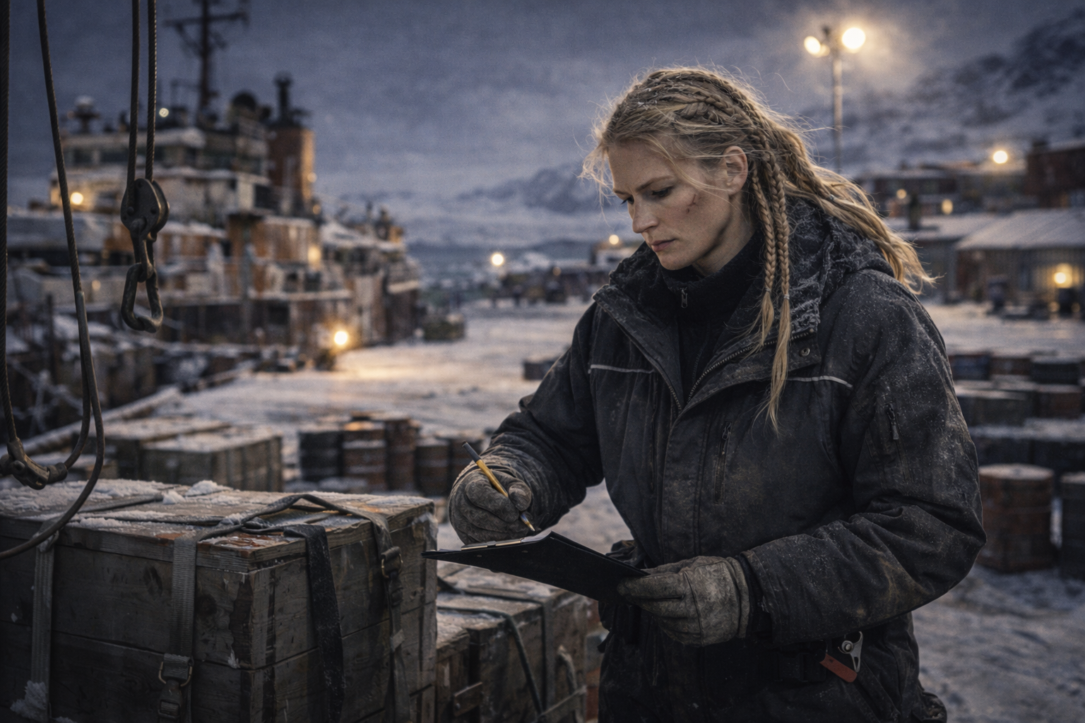 Der Zusammenbruch traf Grönland nicht als Feuersturm – sondern als Abwesenheit. Schiffe kamen seltener. Funk wurde stiller. Ersatzteile blieben aus. Schließlich kam nichts mehr planbar.Als erste Gruppen an der Küste strandeten und aus anderen Regionen „durchsickerten“, war Sila eine der wenigen, die nicht nur an Unterkunft dachte, sondern an das, was danach kommt: Zonen, Lager, Verteilung, Ordnung. Sie organisierte die Docks als kontrollierten Bereich, sammelte Material, definierte Regeln für Ankunft und setzte Prioritäten, bevor Hunger und Angst die Kontrolle übernommen hätten.
