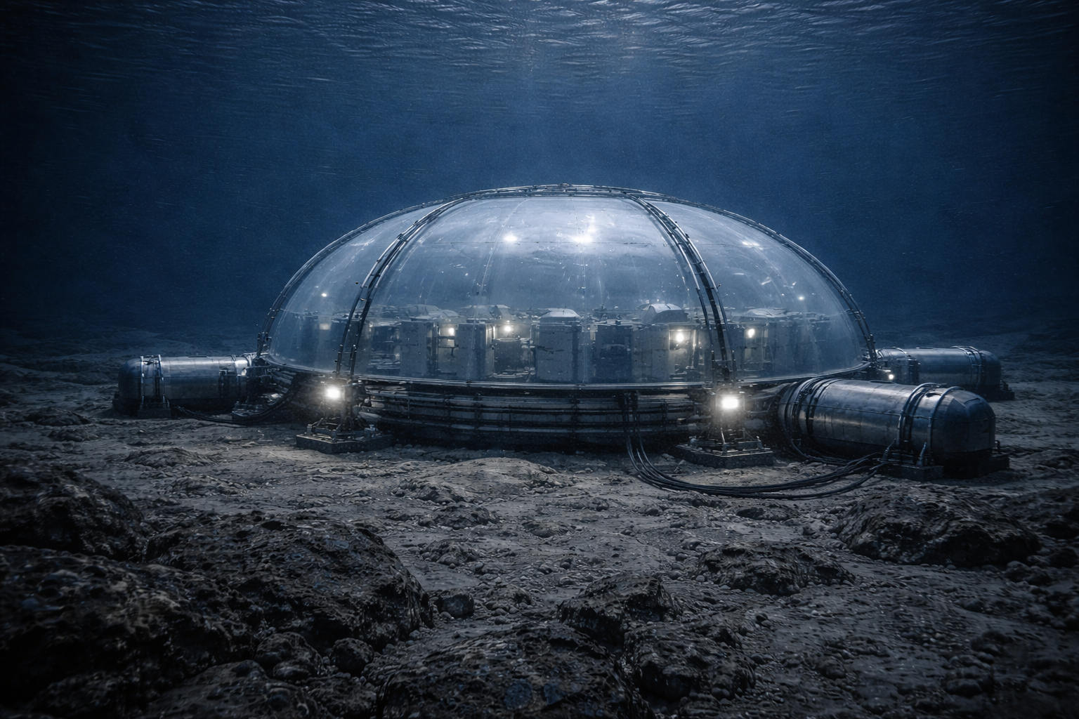 Die Anlage bestand aus mehreren Technikmodulen, die unter einer transparenten Druckhülle zusammengeführt waren.- zentrale transparente Kuppelstruktur aus druckstabilem Polymerverbund